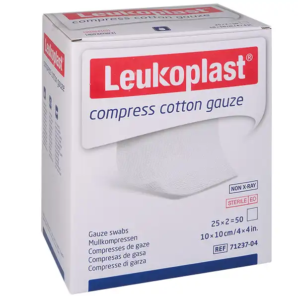 In daily wound care, compresses must reliably fulfil their task and be economical. Leukoplast® compress cotton gauze is ideal for this. It is easy to handle and available in practical dimensions. Leukoplast® compress cotton gauze has cut edges and is available in 8-ply, 12-ply, 16-ply (17-thread) and 32-ply (20-thread). Leukoplast® compress cotton gauze is available as a sterile and non-sterile compress, is absorbent, skin-friendly and breathable.